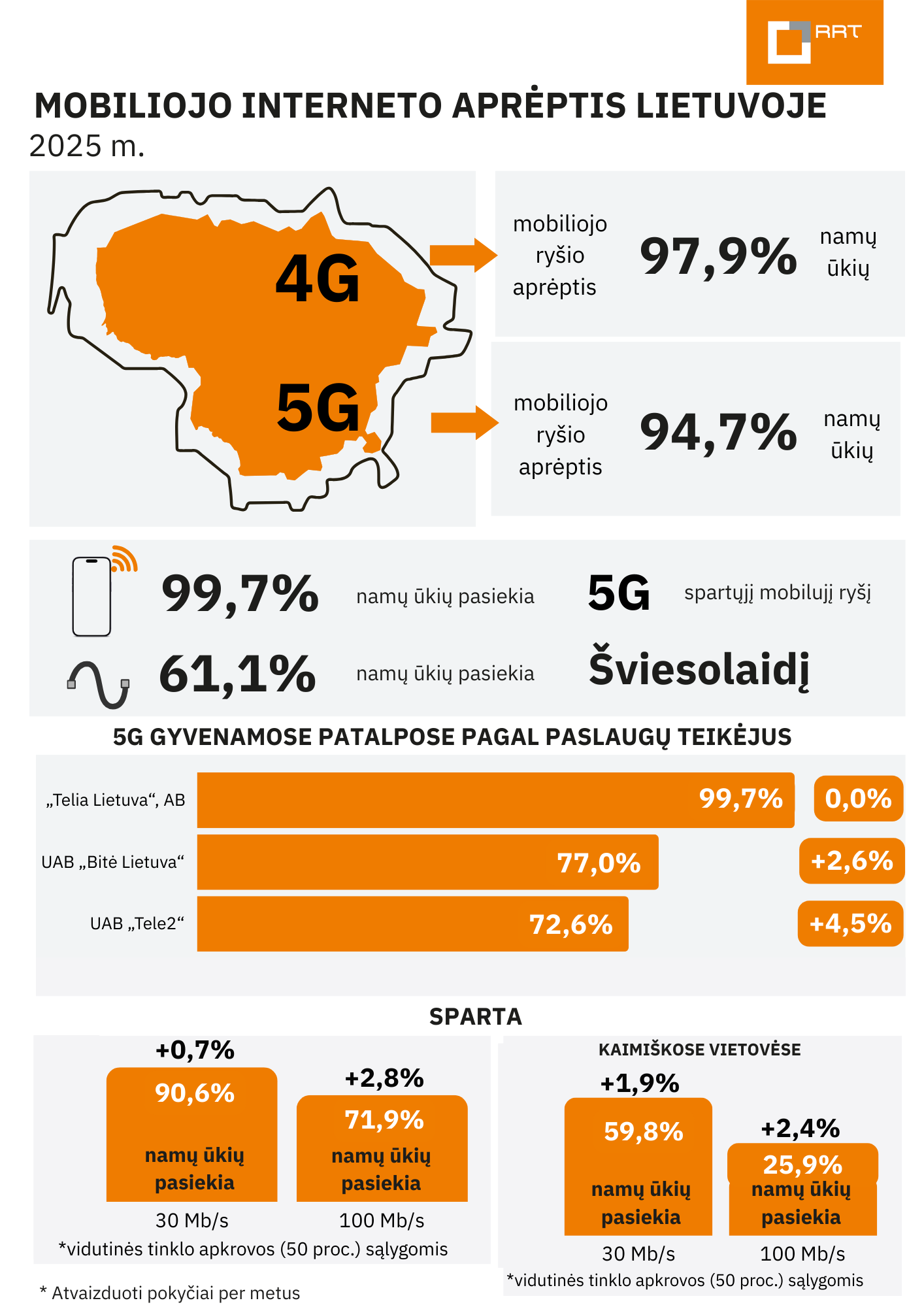 Lietuvoje mobiliojo ryšio aprėptis 4G ryšiu dengia 97,9 proc., o 5G – 94,7 proc. šalies teritorijos. Spartus 5G ryšys jau prieinamas beveik visiems gyventojams – net 99,7 proc. Lietuvos namų ūkių. Vis dėlto Ryšių reguliavimo tarnyba (RRT) atkreipia dėmesį, kad ryšio sparta dar ne visur atitinka keliamus reikalavimus, ypač transporto keliuose.